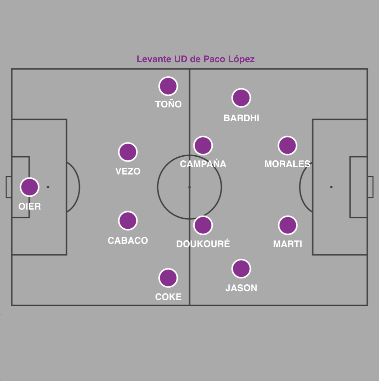 L’un des traits de l’identité du Levante de Paco López est le pressing à la perte. Si avant son arrivée, l’équipe reculait pour mieux attendre, avec lui, elle avance pour donner plus d’incertitude. En phase sans ballon, le replacement discipliné a laissé place au pressing intense de ses offensifs. À domicile ou à l’extérieur, lorsqu’elle évolue en 3-5-2, elle ne compte quasiment pas d’entrejeu. Seul Campaña reste posté devant la défense. Morales, Roger, Jason, Bardhi, Rochina et les ailiers sont eux chargés d’établir un pressing de tous les instants. Quitte ou double.