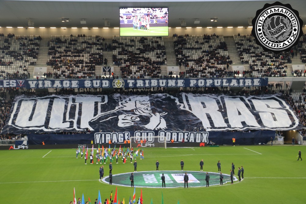 Ce classique du championnat de France entre Lyonnais et Bordelais était l’occasion pour le Virage Sud de proposer un tifo, malgré un conflit toujours tenace entre les Ultramarines et la direction du club girondins. Les UB87 déploient un voile couleur marine sur la partie basse du virage, sur lequel on distingue le logo du groupe au centre, entouré du mot « ULTRAS ». Le voile est accompagné d’une bâche « VIRAGE SUD BORDEAUX ».