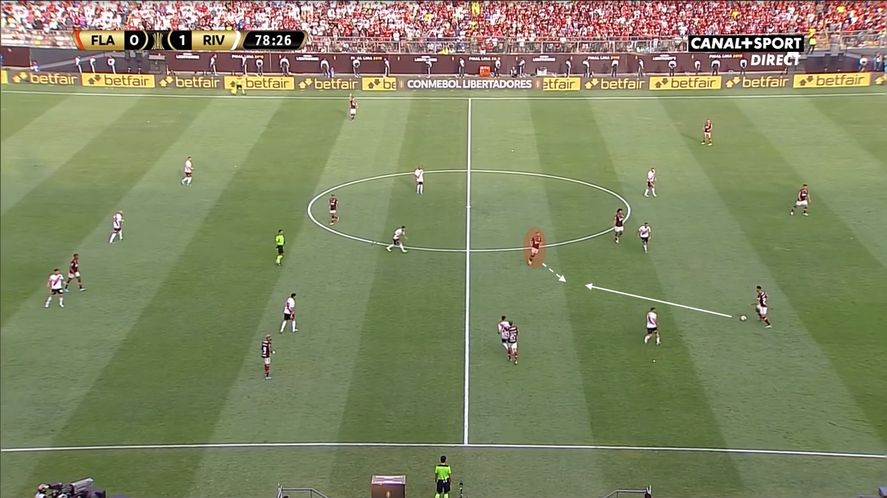 River Plate vient de récupérer le ballon dans l’axe, joue en profondeur vers l’extérieur pour étirer les deux centraux de Flamengo en couverture.