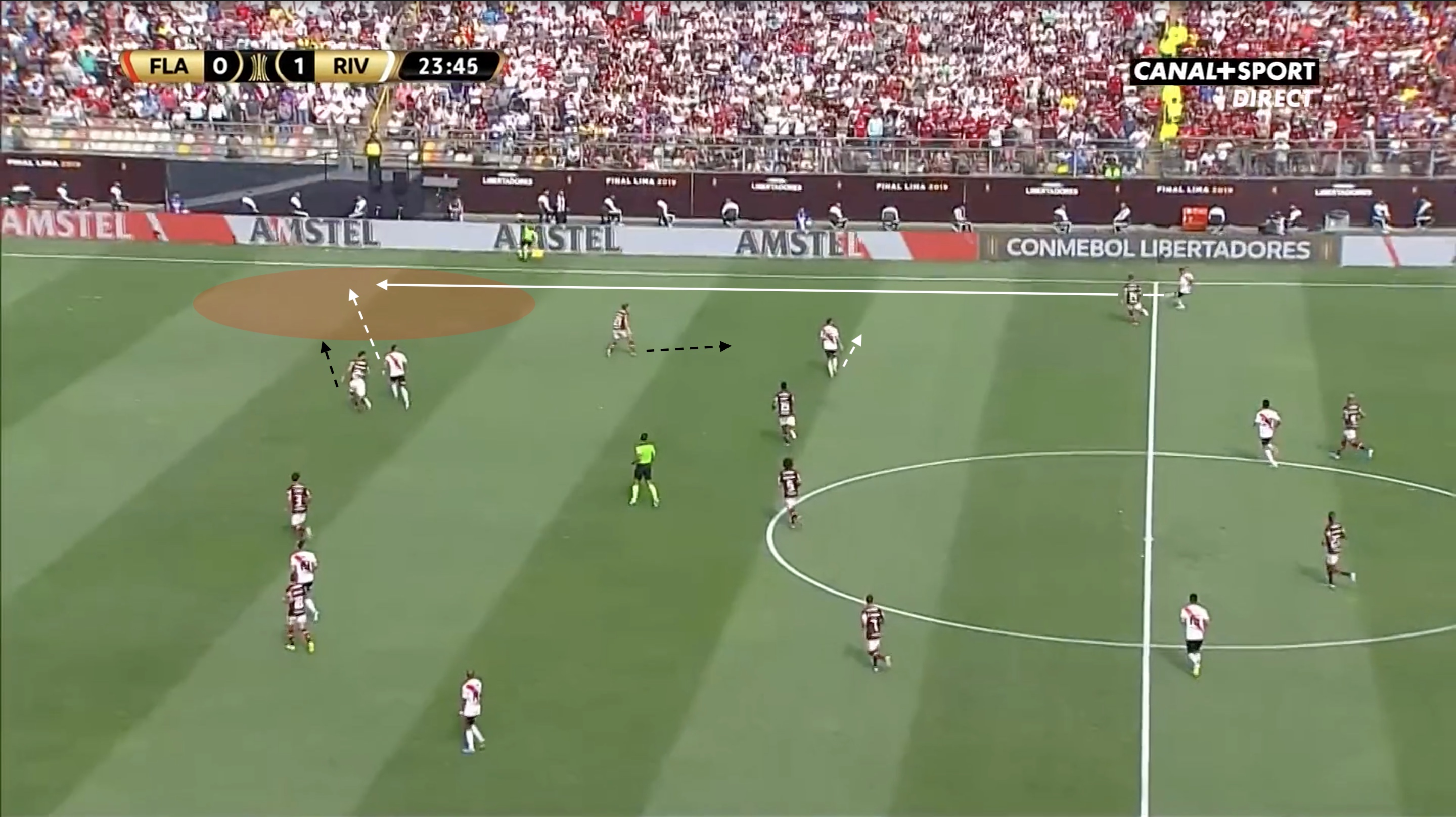 L’objectif de Marcelo Gallardo était clair au moment de la transition offensive : River Plate a cherché à vite jouer vers l’avant en fonction de la zone de récupération. D’abord, lorsque le ballon était récupéré dans l’axe, l’ambition était de trouver un ailier par une passe verticale pour créer de la largeur, attirer l’un des deux ou trois joueurs de Flamengo en couverture loin de la surface et pénétrer à l’intérieur grâce à des projections dans les intervalles. Puis, quand le ballon était récupéré sur un côté, le latéral opposé (Montiel ou Casco) avait un rôle déterminant à jouer en offrant une largeur maximale afin de jouer en profondeur dans l’espace le long de la ligne de touche avant que le bloc de Flamengo ne coulisse. Ce que le Grêmio de Renato Gaúcho n’avait pas réussi à réaliser en demi-finale (1-1 aller, 5-0 retour).