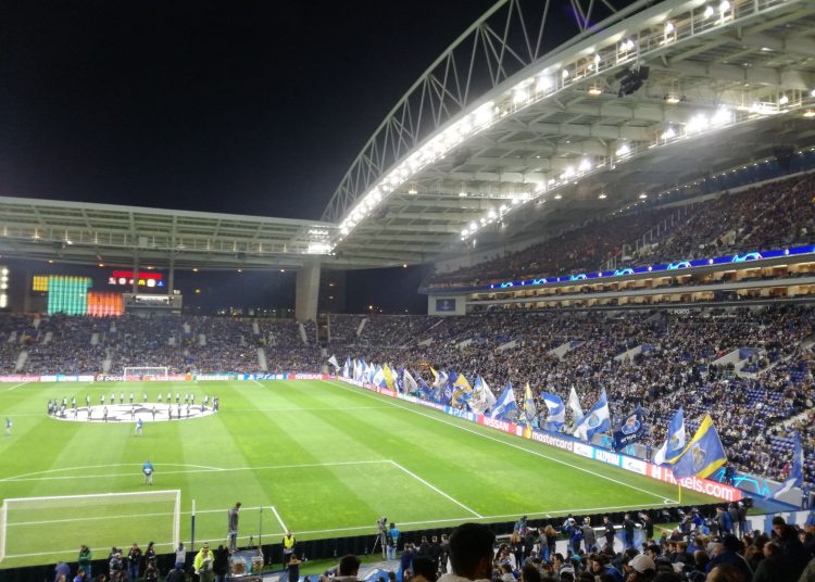 Au moment du mythique hymne de la Ligue des champions, un grand voile avec l’emblème de l’équipe, s’étale sur tout le virage en descendant du haut. Le début du match est un peu crispé, les spectateurs le savent et poussent leur équipe avec enthousiasme et optimisme : força Porto, força Porto … À la 26ème, Manolas, pas un expert de la construction de jeu, se fait arracher le ballon par Moussa Marega qui sert le Brésilien Soares pour l’ouverture du score. Une explosion de joie retentit dans tout le stade : são Super Dragoẽs, vous êtes des Super Dragons.