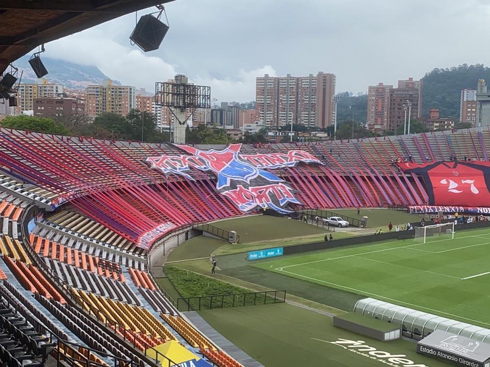 En Colombie, le mois de mars était celui du Clásico paisa, le « classique des paysans » entre les deux clubs phares de la ville de Medellín. Aà cette occasion, les fans de l’Independiente ont recouvert leur tribune de bandes verticales aux couleurs du club. Au milieu, on trouve un voile portant le logo du club et le nom du groupe : Rexixtenxia Norte.