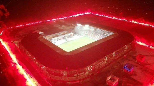 Très grosse ambiance, à l’Arena Zabrze en Pologne, où les ultras locaux fêtaient les 70 ans de leur club, le Górnik Zabrze. Durant la rencontre, un voile, aux couleurs du club a été déployé en tribune, accompagné d’un gros craquage de fumigènes et des messages suivants : « Górnik Zabrze, c’est notre vie », « le respect construit durant toutes ces années ». Quelques jours avant la rencontre, les fans du Górnik Zabrze avaient réalisé une immense animation pyrotechnique autour de l’Arena Zabrze.