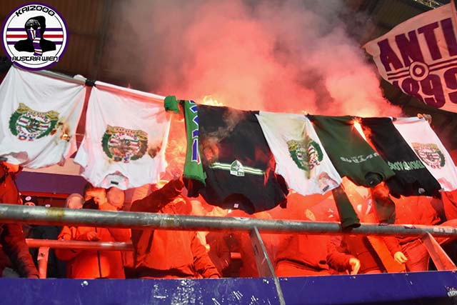 Ambiance de feu à Vienne, pour le derby opposant l’Austria au Rapid Vienne. Les locaux ont mis le paquet : Un tifo en 3 étapes. Tout d’abord, une levée d’écharpes accompagnée de pots de fumée. Puis le déploiement de deux voiles géants, façon Read Dead Redemption (un jeu vidéo de Western), avec des pots de fumée, toujours, et les banderoles suivante s : « Aujourd’hui est le jour du dernier tir », « Puis, l’Austria Vienne sera sauvé par une victoire dans les derniers instants ». L’animation sera conclue par un nouveau tendu d’écharpes accompagné d’un craquage en règle.