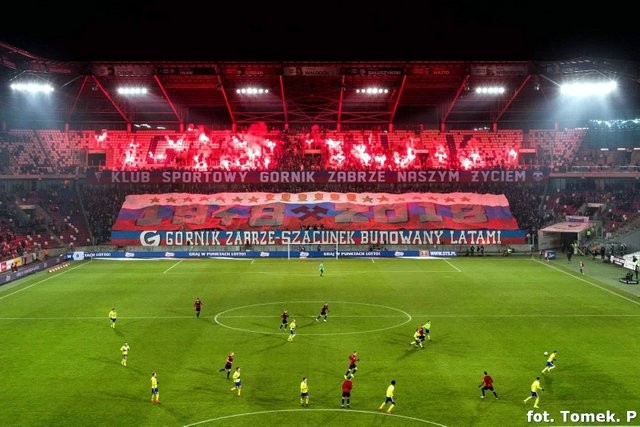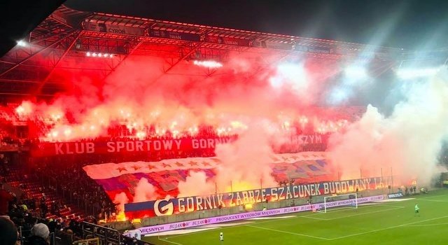 Très grosse ambiance, à l’Arena Zabrze en Pologne, où les ultras locaux fêtaient les 70 ans de leur club, le Górnik Zabrze. Durant la rencontre, un voile, aux couleurs du club a été déployé en tribune, accompagné d’un gros craquage de fumigènes et des messages suivants : « Górnik Zabrze, c’est notre vie », « le respect construit durant toutes ces années ». Quelques jours avant la rencontre, les fans du Górnik Zabrze avaient réalisé une immense animation pyrotechnique autour de l’Arena Zabrze.