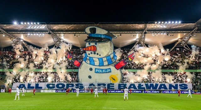 La police constitue, avec l’UEFA, l’une des cibles privilégiées des Legioniści. Nouvelle preuve avec ce tifo à voile déployé lors de la réception du Piast Gliwice et représentant un policier en bonhomme de neige prêt à être dynamité. Le message reprend le fameux All Cops Are Bastards (ACAB) en remplaçant « Bastards » par « Balwans ». En polonais, l’expression Balwans qui se traduit par bonhomme de neige, est utilisée comme une insulte en Pologne pour traiter quelqu’un de « stupide ». Le tifo est complété d’une belle animation pyrotechnique.