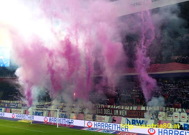Ambiance de feu à Vienne, pour le derby opposant l’Austria au Rapid Vienne. Les locaux ont mis le paquet : Un tifo en 3 étapes. Tout d’abord, une levée d’écharpes accompagnée de pots de fumée. Puis le déploiement de deux voiles géants, façon Read Dead Redemption (un jeu vidéo de Western), avec des pots de fumée, toujours, et les banderoles suivante s : « Aujourd’hui est le jour du dernier tir », « Puis, l’Austria Vienne sera sauvé par une victoire dans les derniers instants ». L’animation sera conclue par un nouveau tendu d’écharpes accompagné d’un craquage en règle.