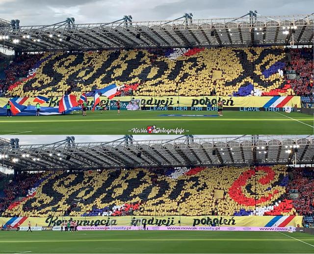 Le derby de Cracovie en Pologne, appelé Święta Wojna (« guerre sainte ») ne pouvait pas décevoir en tribune. En première période les supporters déploient un tifo à feuilles avec écrit « Secteur X », puis Secteur C (l’emplacement actuel), en référence à leur tribune et au légendaire « dix ». Dessous, une banderole : « Poursuite de la tradition des générations ».