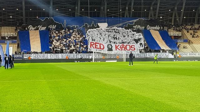 En seconde division française, les Red Kaos de Grenoble fêtent leur 25 ans avec notamment une énorme bâche reprenant sous forme de stickers le vécu du groupe.. Une belle réalisation, peut-être inspirée par le tifo des ultras de Francfort face à Chelsea en mai dernier.