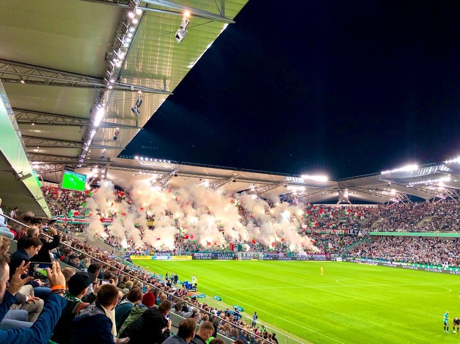 Le derby de Cracovie en Pologne, appelé Święta Wojna (« guerre sainte ») ne pouvait pas décevoir en tribune. En première période les supporters déploient un tifo à feuilles avec écrit « Secteur X », puis Secteur C (l’emplacement actuel), en référence à leur tribune et au légendaire « dix ». Dessous, une banderole : « Poursuite de la tradition des générations ».