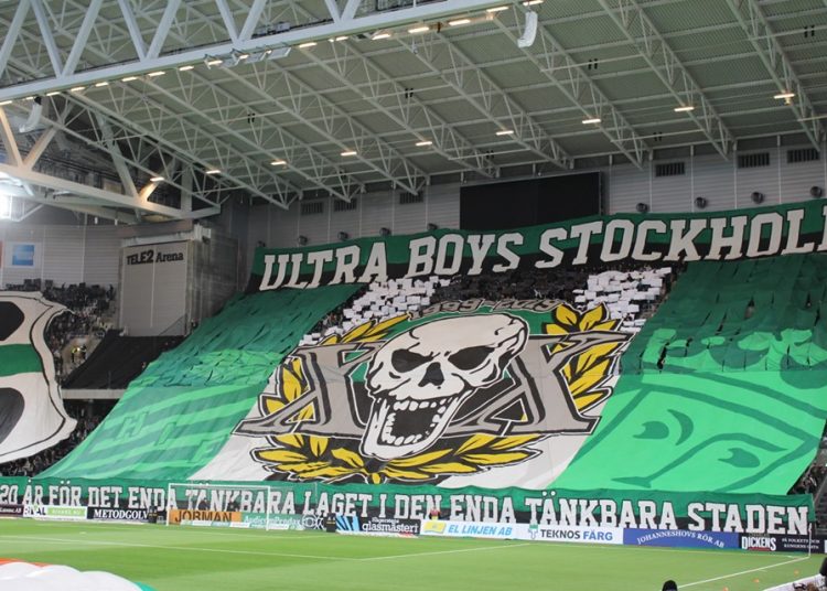 Les Ultras Boys Stockholm fêtent leur 20 ans en mettant en avant leur symbole, le crâne, entouré de blasons avec les dates. Sur la banderole : « 20 ans pour la seule équipe et pour notre ville ». Dans un deuxième temps, un craquage massif de fumigènes sur la tribune haute et le message « toujours jeune » pour faire écho à leur vingt ans de supportérisme. Le crâne intemporel (mais néanmoins synonyme de mort) laisse la place au visage de Ian Brown, chanteur du groupe anglais Stone Roses, régulièrement utilisé sur les stickers des UB.