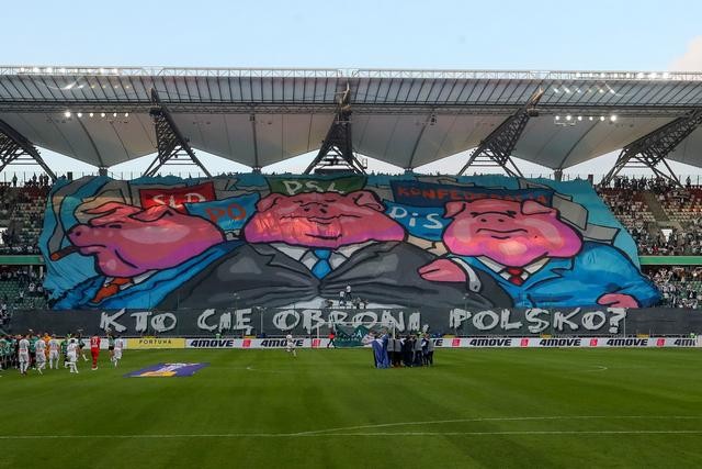Une bâche avec des porcs bien roses et dodus en costard cravate, ça rappelle forcément les gérants des hautes instances. Les supporters du Legia reprennent leur représentation porcine déjà utilisée dans un célèbre précédent tifo pour représenter les dirigeants de l’UEFA qui se gavent d’argent en mettant des amendes aux supporters (notamment). Sur la banderole, une interrogation : « Qui va te défendre, Pologne ? ». S’en suit un craquage massif sur de nombreux drapeaux aux couleurs du club. Preuve qu’après l’élite, les supporters reprennent le pouvoir.