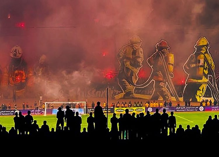 Du côté des supporters du Wydad, la première réalisation montre un empereur avec ses esclaves, devant un tifo à feuilles présentant un château, avec une banderole en arabe puis en français, celle-ci taclant le père Jégo, fondateur du Wydad en 1939 resté dans l’histoire du club pour avoir remporté de nombreux titres, mais aussi pour être parti au Raja : « De la gloire à la connerie. Du club de la résistance à celui de la tromperie ». Son nom en feuilles et le voile le représentant ne sont pas pour le célébrer, mais pour provoquer l’équipe d’en face. Après un craquage massif de fumigènes, des pompiers ultras réalistes se dressent sur un voile pour éteindre les tribunes embrasées du virage nord. Tout simplement exceptionnel.